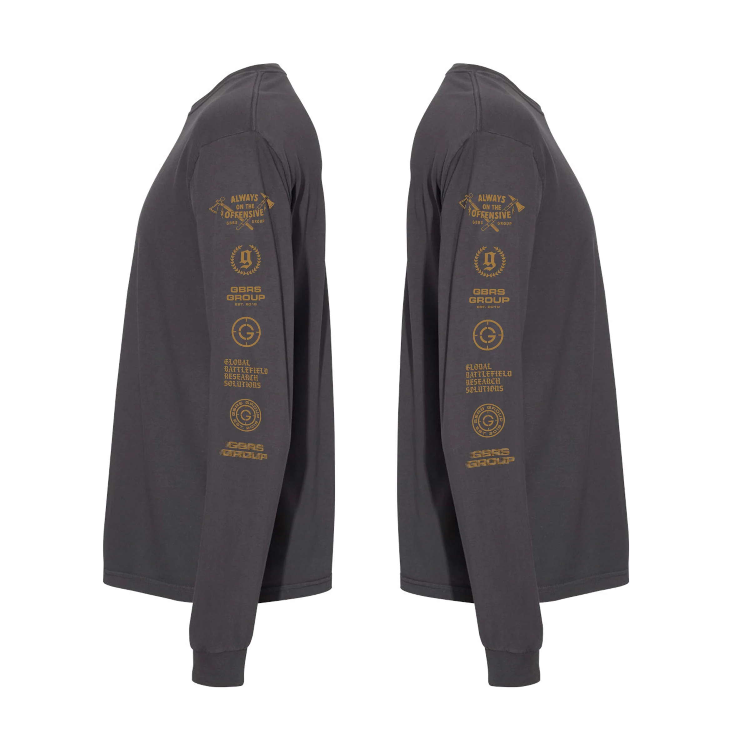 - GBRS logo variations screen printed down both sleeves