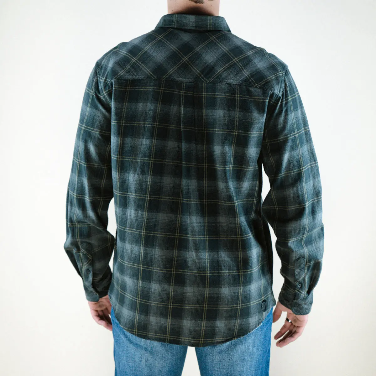Qualities of this flannel include the flat-felled construction of the shoulder, side, and armhole seams for added reinforcement, custom logo button closures, back shoulder pleats, and adjustable cuffs.